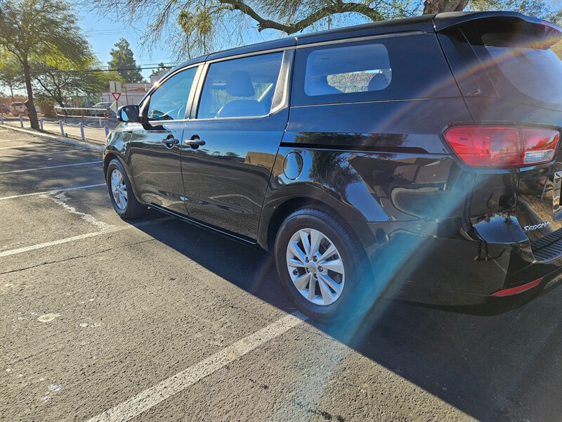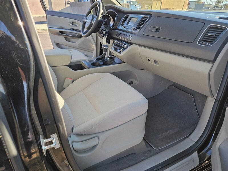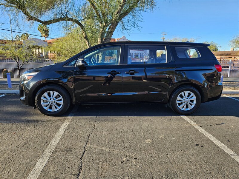 2017 Kia Sedona L — powered by a 3.3L V6 producing 276 hp and 248 lb-ft of torque, paired with a smooth automatic transmission and front-wheel drive. Factory-standard equipment includes seating for seven with a versatile fold-flat third row and sliding second-row seats, durable cloth upholstery, tri-zone automatic climate control, Bluetooth hands-free calling and audio streaming, AM/FM/MP3 audio with USB/Aux inputs, steering-wheel audio and cruise controls, rearview camera, power windows and locks with remote keyless entry, ABS with stability and traction control, multiple airbags and tire pressure monitoring. This vehicle has excellent overall condition, under 84,000 miles (averaging less than 9,000 miles per year) and EPA-rated at 18 MPG city / 24 MPG highway.
